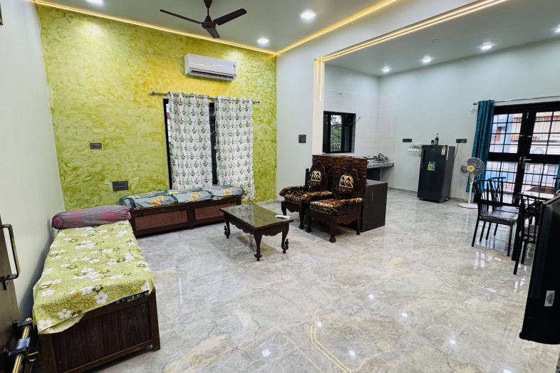 This 1BHK unit is a fully private and independent section of Shivprem Homestay, suitable for up to 5 guests. It includes one spacious bedroom with a king-size bed, air conditioning, a study table, and clean, comfortable bedding. The adjoining living room features two single beds, a dining table, a wall-mounted television, air conditioning, and high-speed WiFi, making it ideal for both families and working professionals.