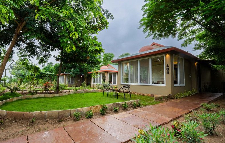 Our luxury cottages offer a private garden featuring a cozy coffee table seating area, leading to a luxurious air-conditioned living space with French windows. A spacious bedroom with a king-size bed alongside a spacious bathroom with an Open To Sky shower area, redefines luxury at its best.
